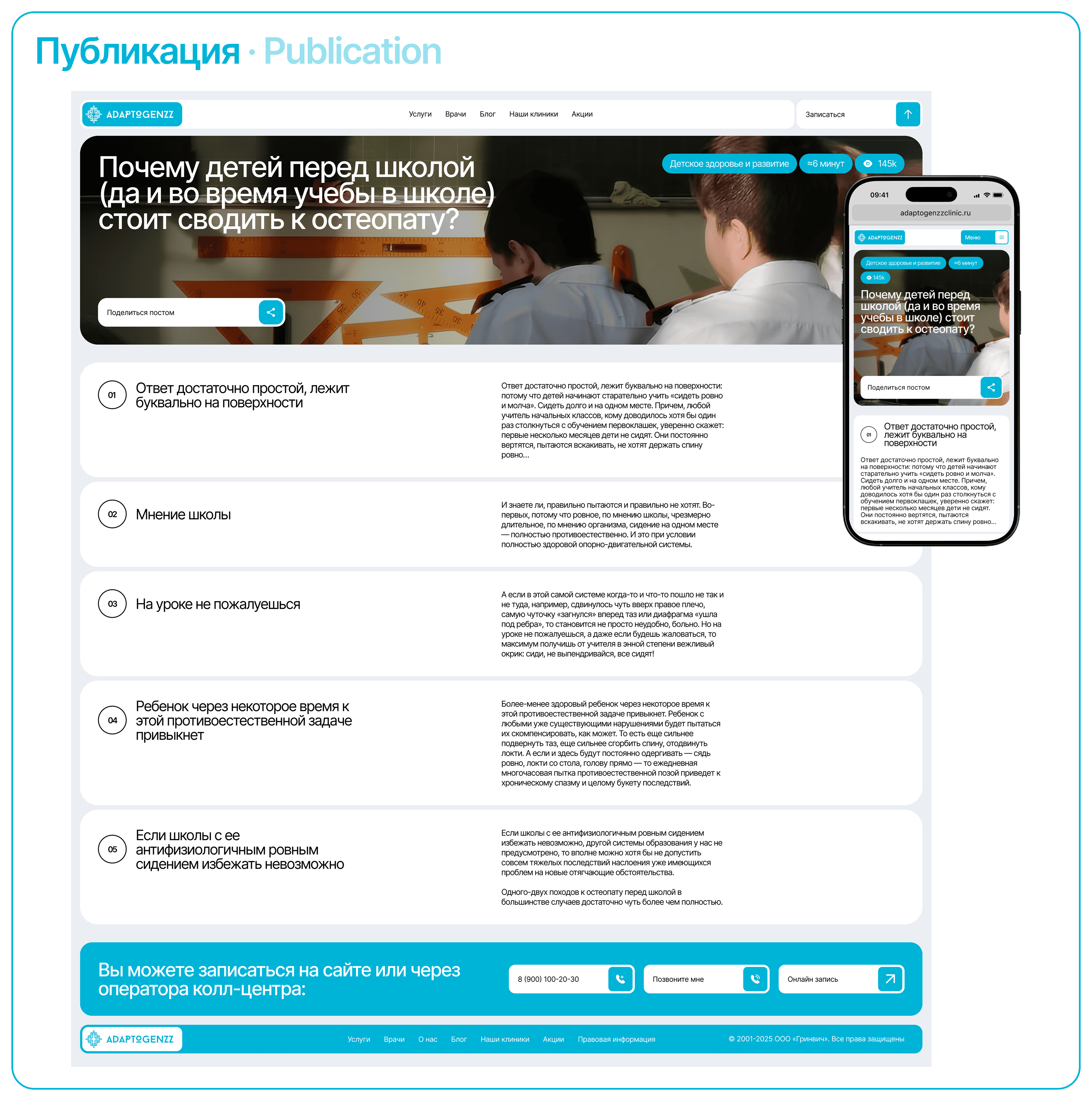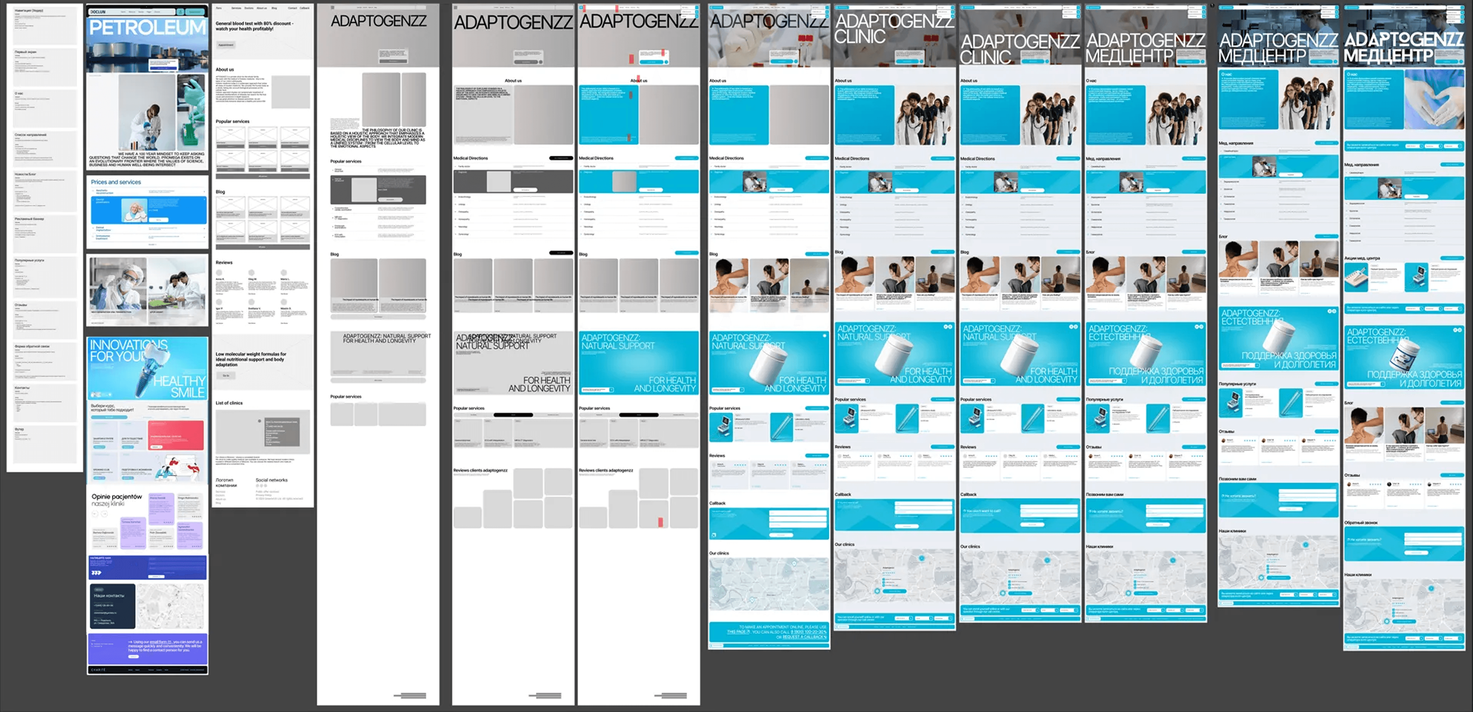 Медицинский центр Adaptogenzz, имеют несколько филиалов в Москве. Данный коммерческий проект выполнялся пока я был в ExtentLab: я самостоятельно реализовал полный редизайн сайта.