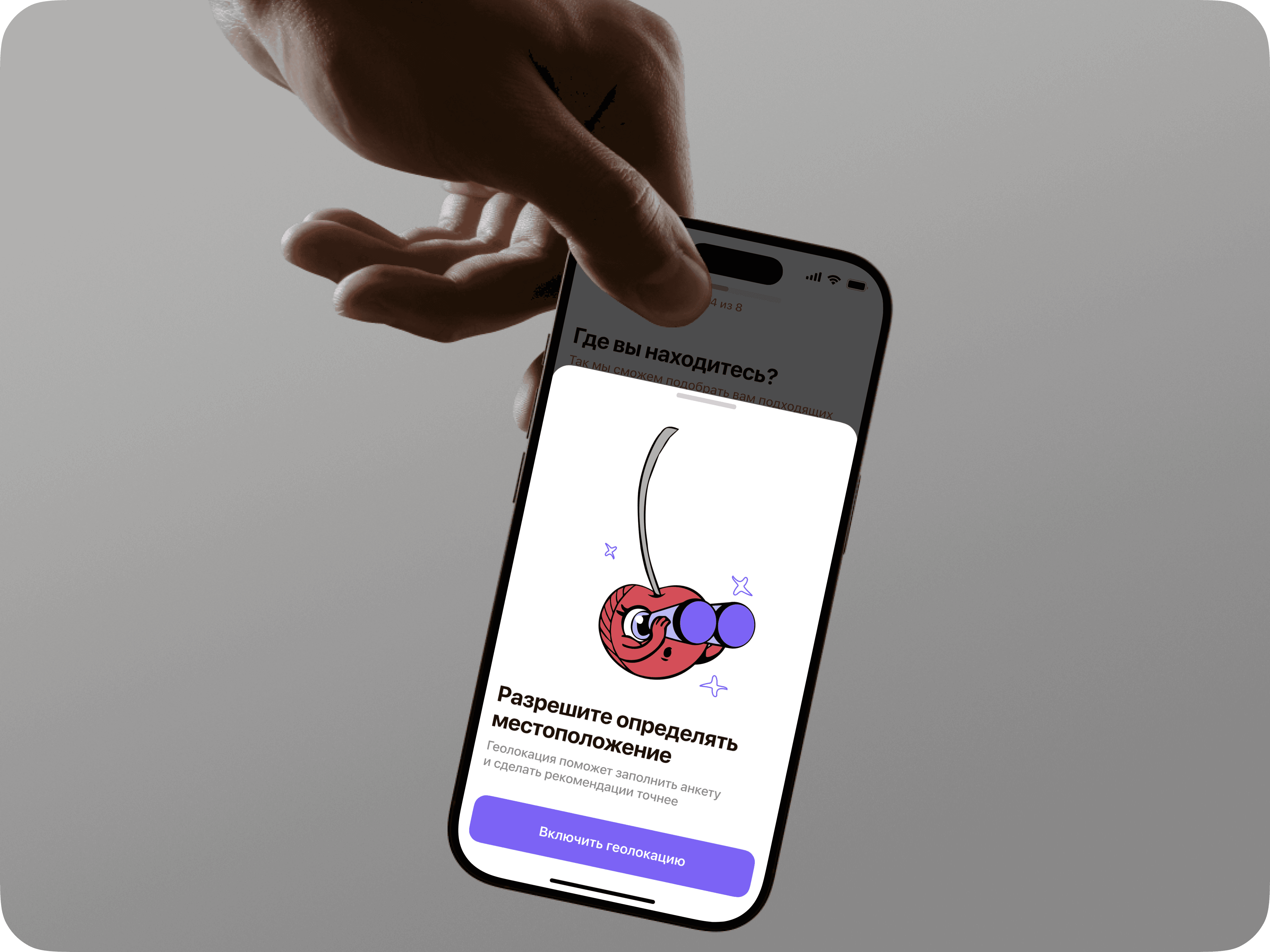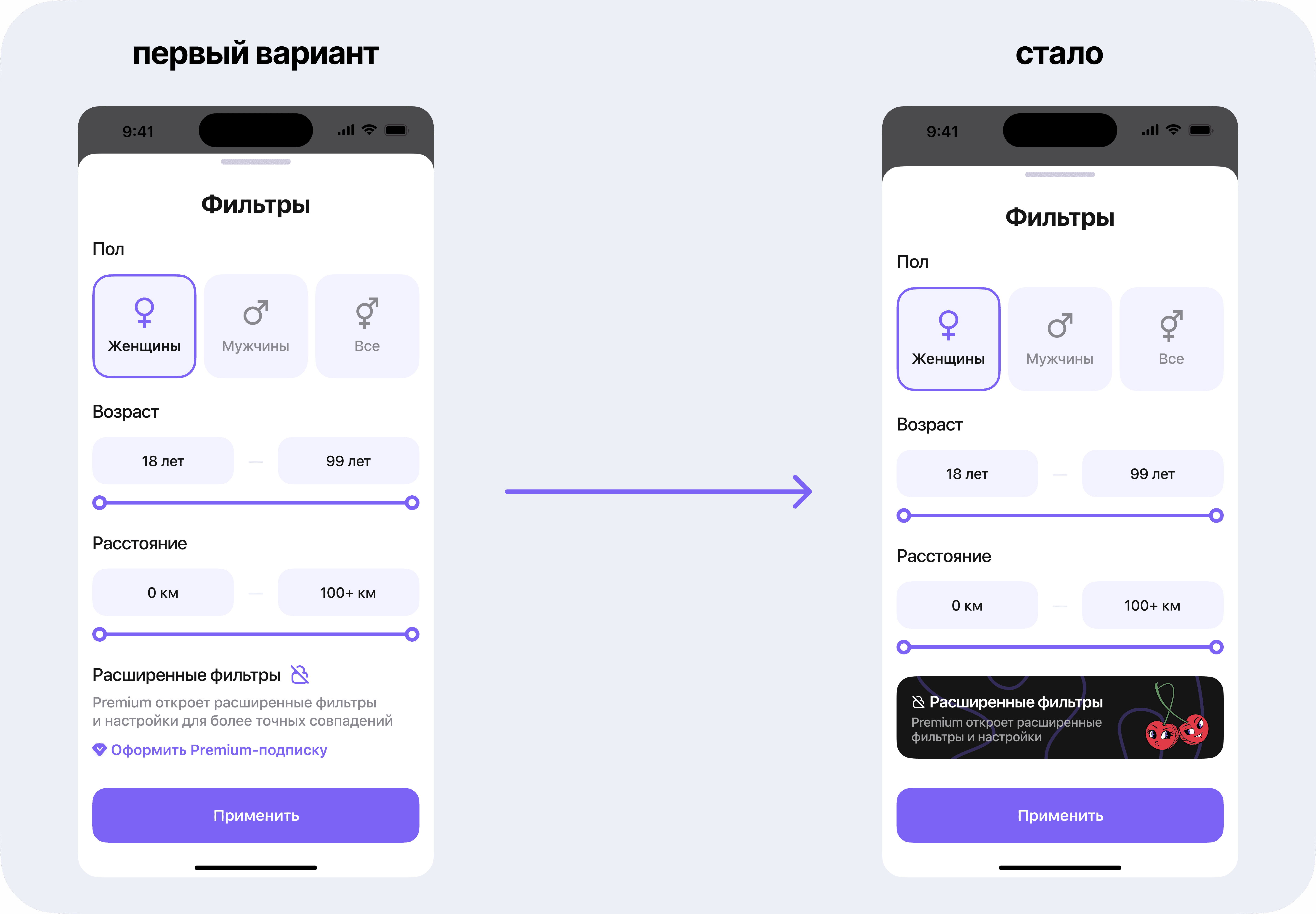 В приложении, в окне фильтров показываемых анкет, размещён призыв оформить подписку. В изначальной отрисовке описание и ссылка на покупку практически не привлекали внимания: да, использовался акцентный цвет, но из-за большого количества фиолетового в данном поп-апе он воспринимался скорее как базовый, особенно в контексте рекламного предложения. Поэтому было принято решение сделать чуть более «инородный» баннер, но при этом все также в рамках общей стилистики продукта.