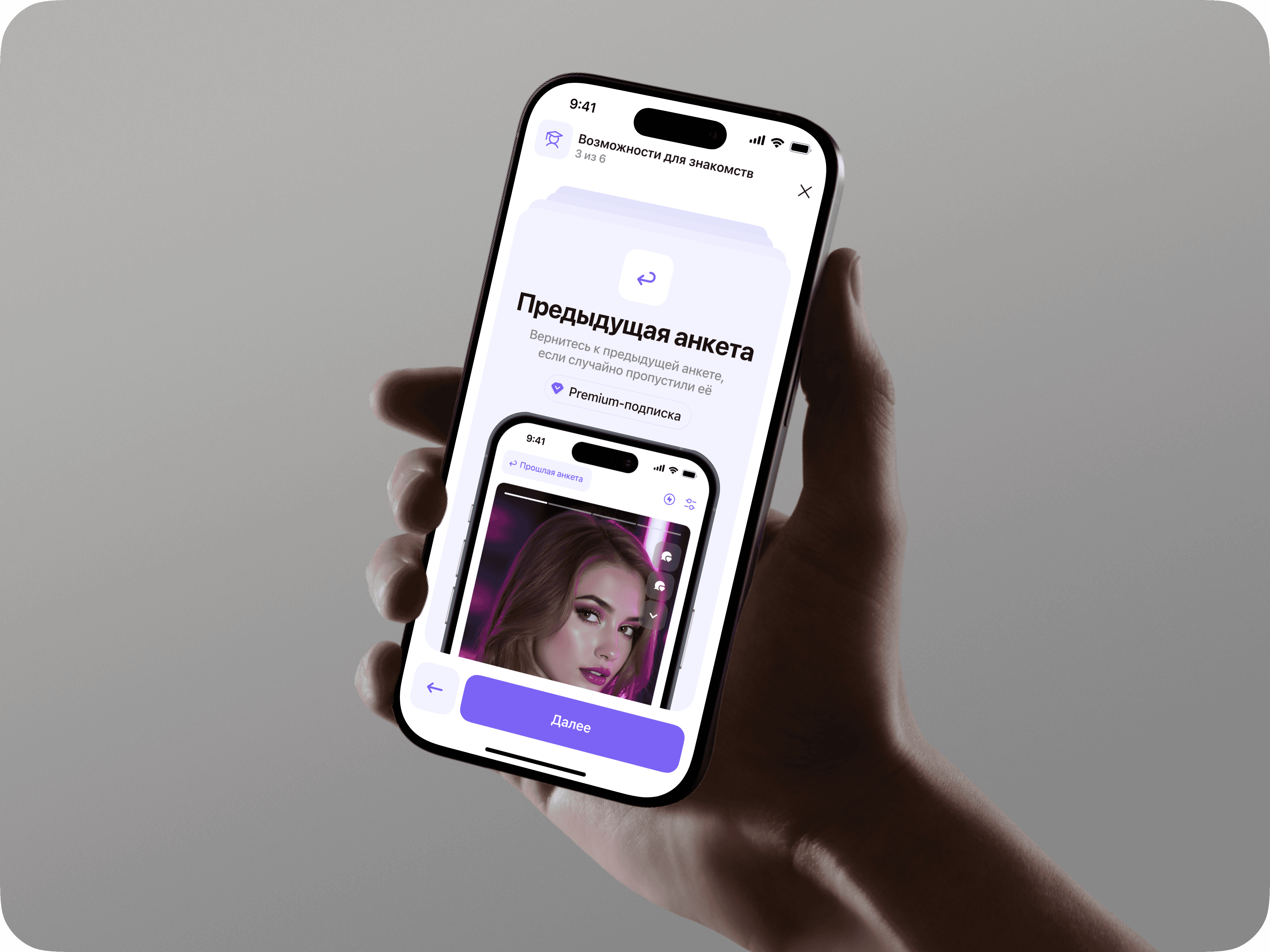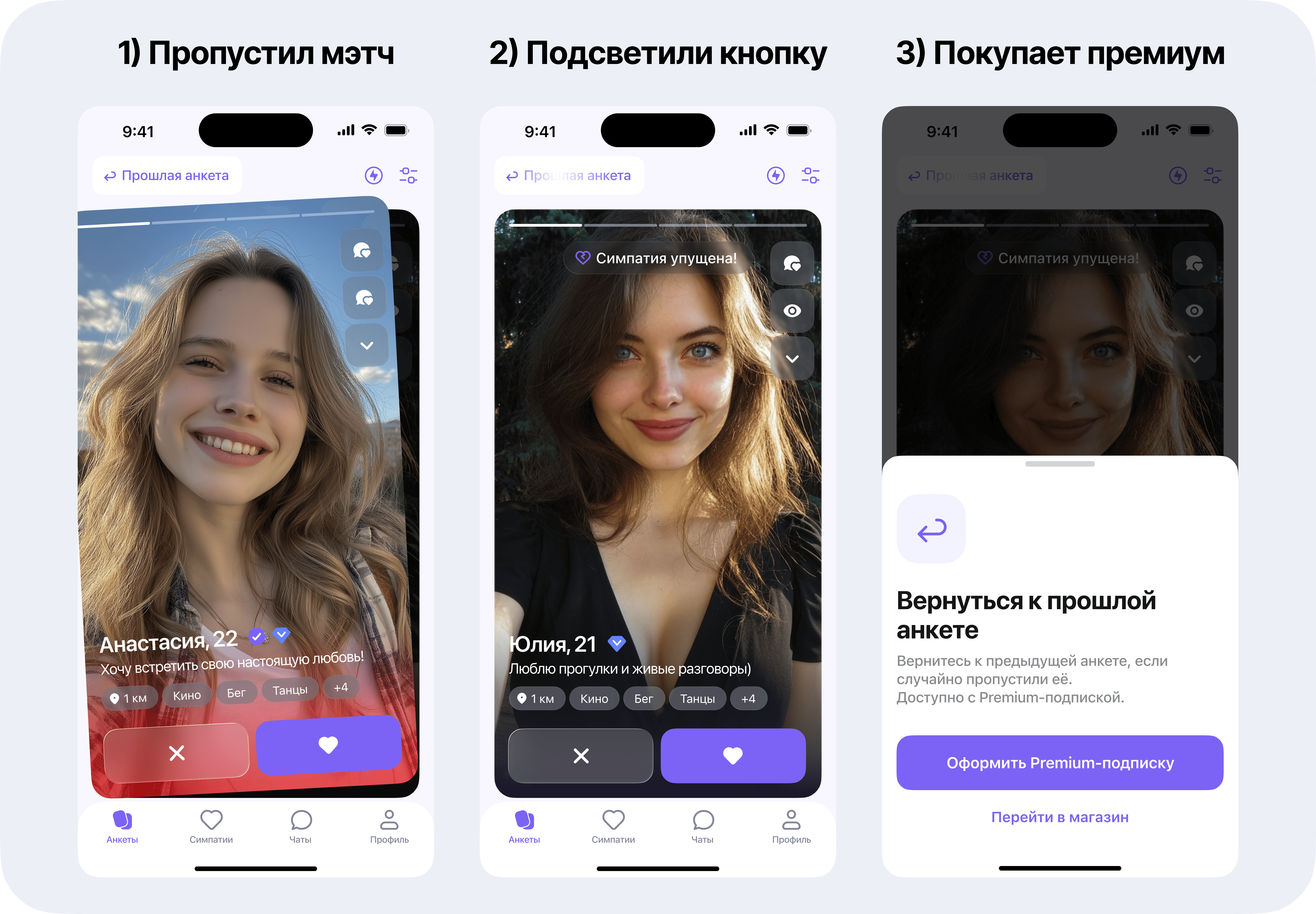 В сервисе предусмотрена возможность вернуться к предыдущей анкете, если пользователь случайно её пропустил. Однако эта функция доступна только по премиум-подписке. Когда пользователь пропускает анкету человека, который поставил ему «лайк», приложение аккуратно сообщает об этом и с помощью анимации подсвечивает кнопку «Прошлая анкета», чтобы пользователь мог ответить взаимностью.