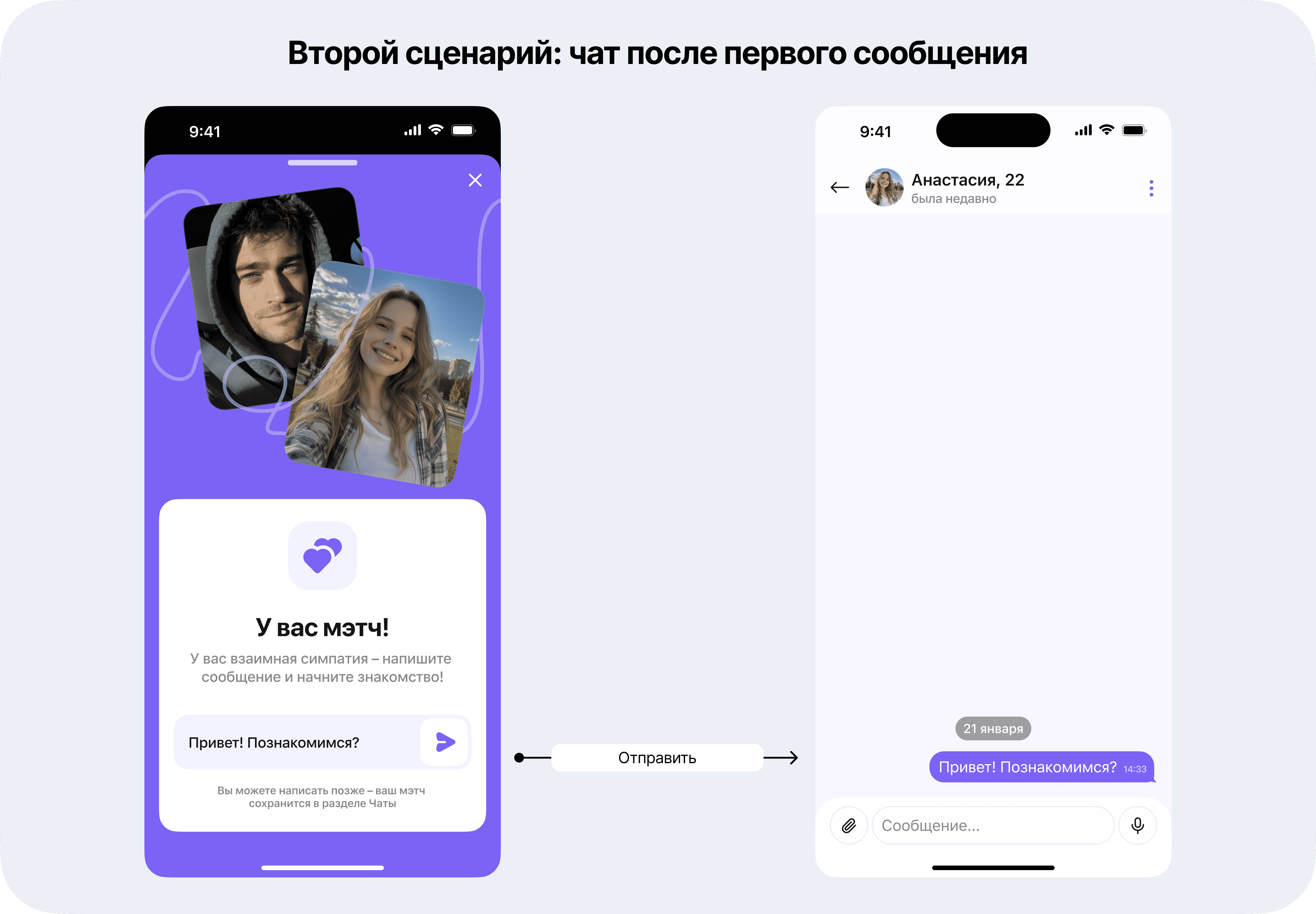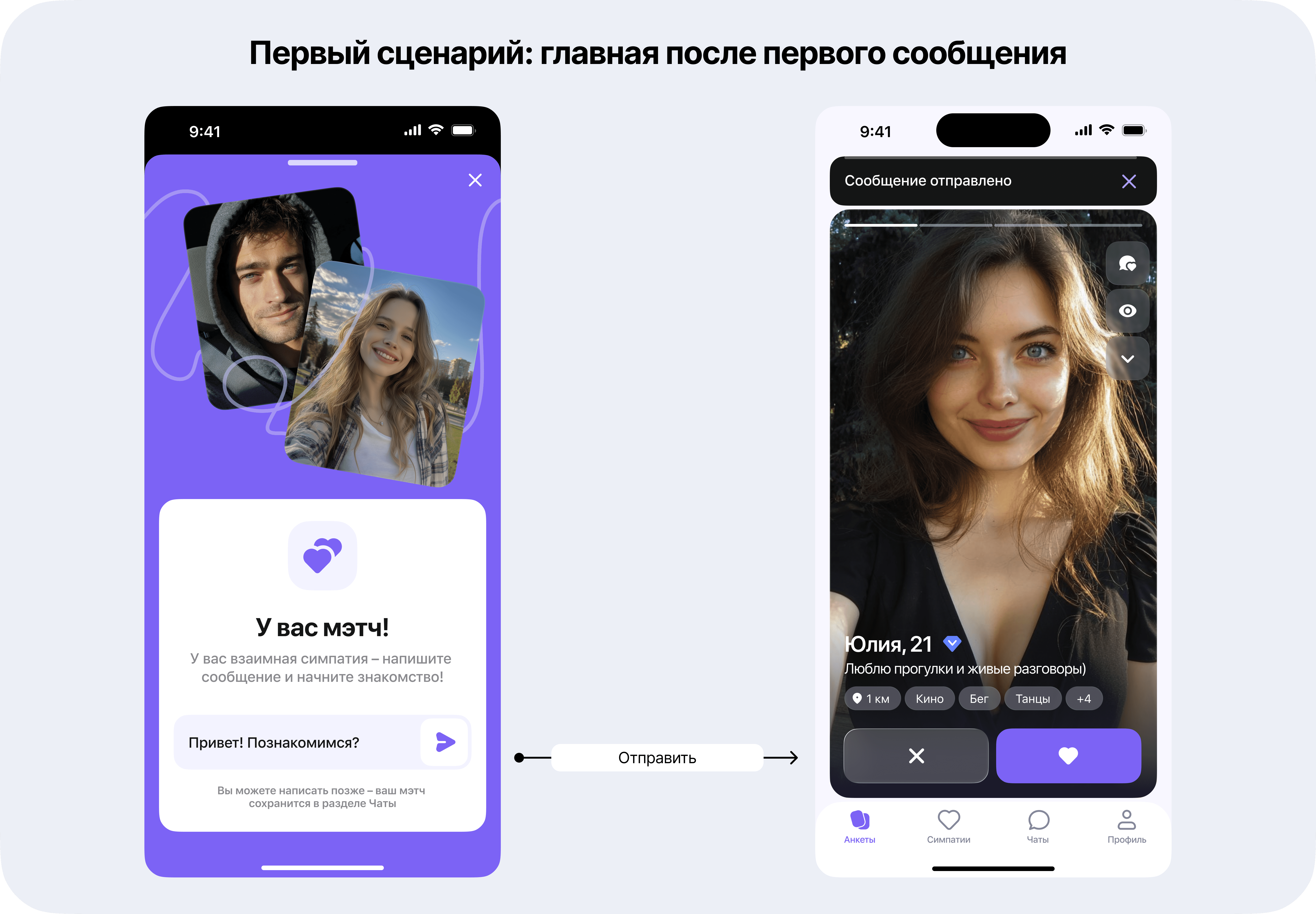 Чтобы понять, какой вариант будет удобнее для пользователей, необходимо сначала отследить и собрать метрики: отправляют ли пользователи второе сообщение сразу после мэтча или сразу возвращаются к просмотру анкет. Поэтому мы отрисовали оба сценария, чтобы в дальнейшем, в зависимости от полученных метрик, применить наиболее подходящий.