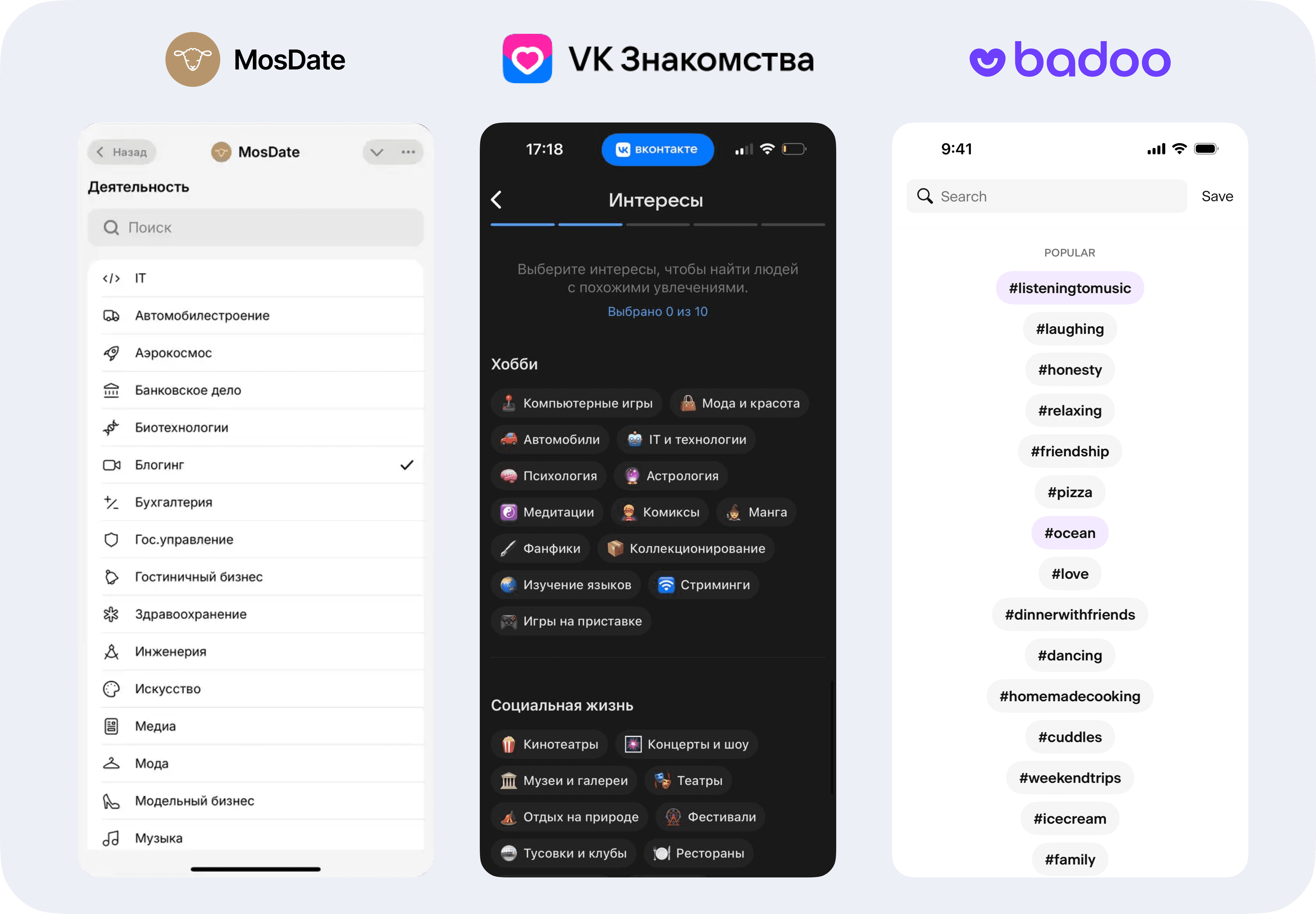 Проанализировав конкурентов, мы столкнулись с интересным наблюдением: почти все крупные дейтинги предлагают выбирать увлечения и интересы из сплошного, нескончаемого списка категорий. При этом для нас данный этап как для продукта достаточно важен — эти данные, по сути, составляют половину успеха в рекомендации действительно подходящих анкет пользователю.