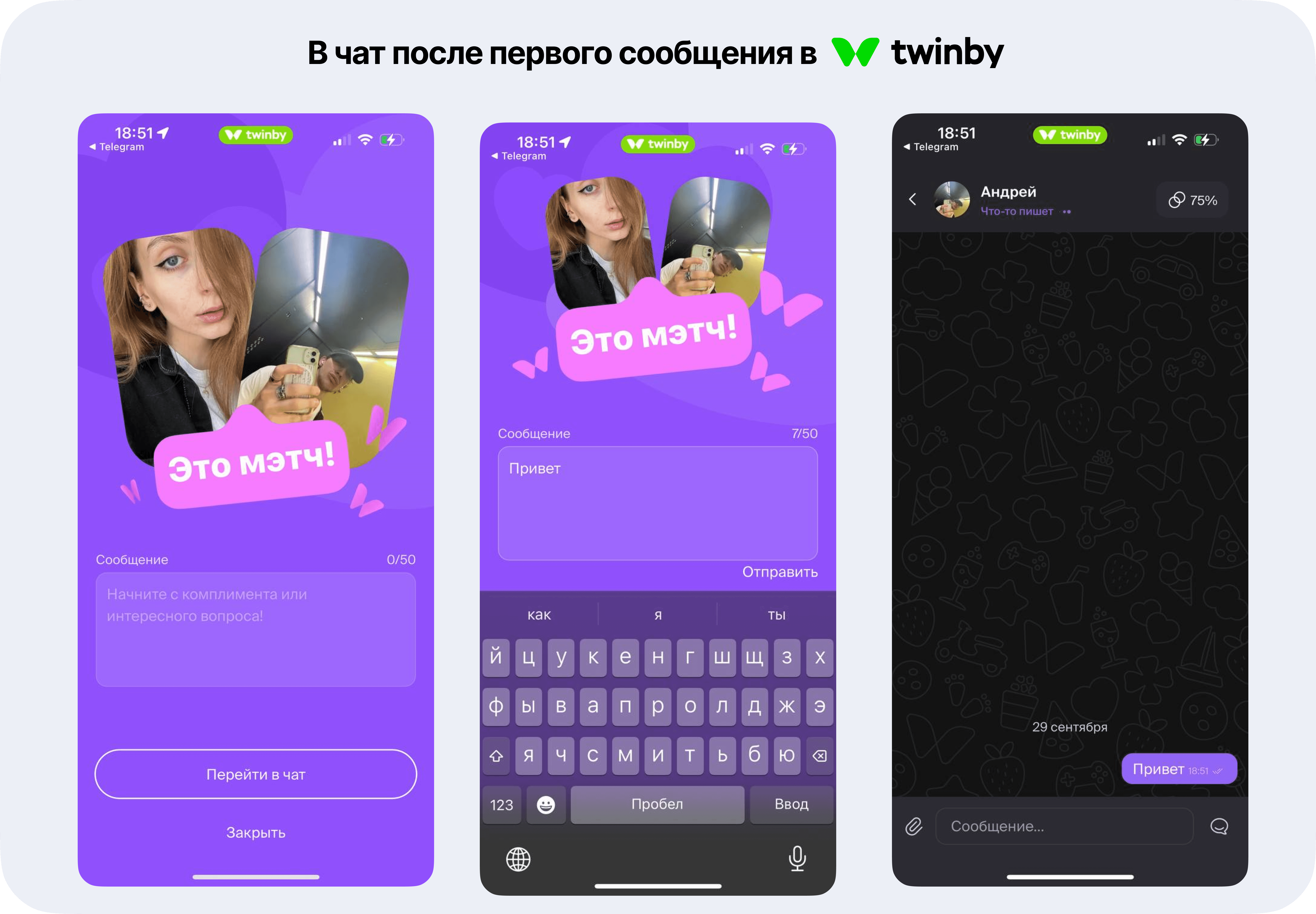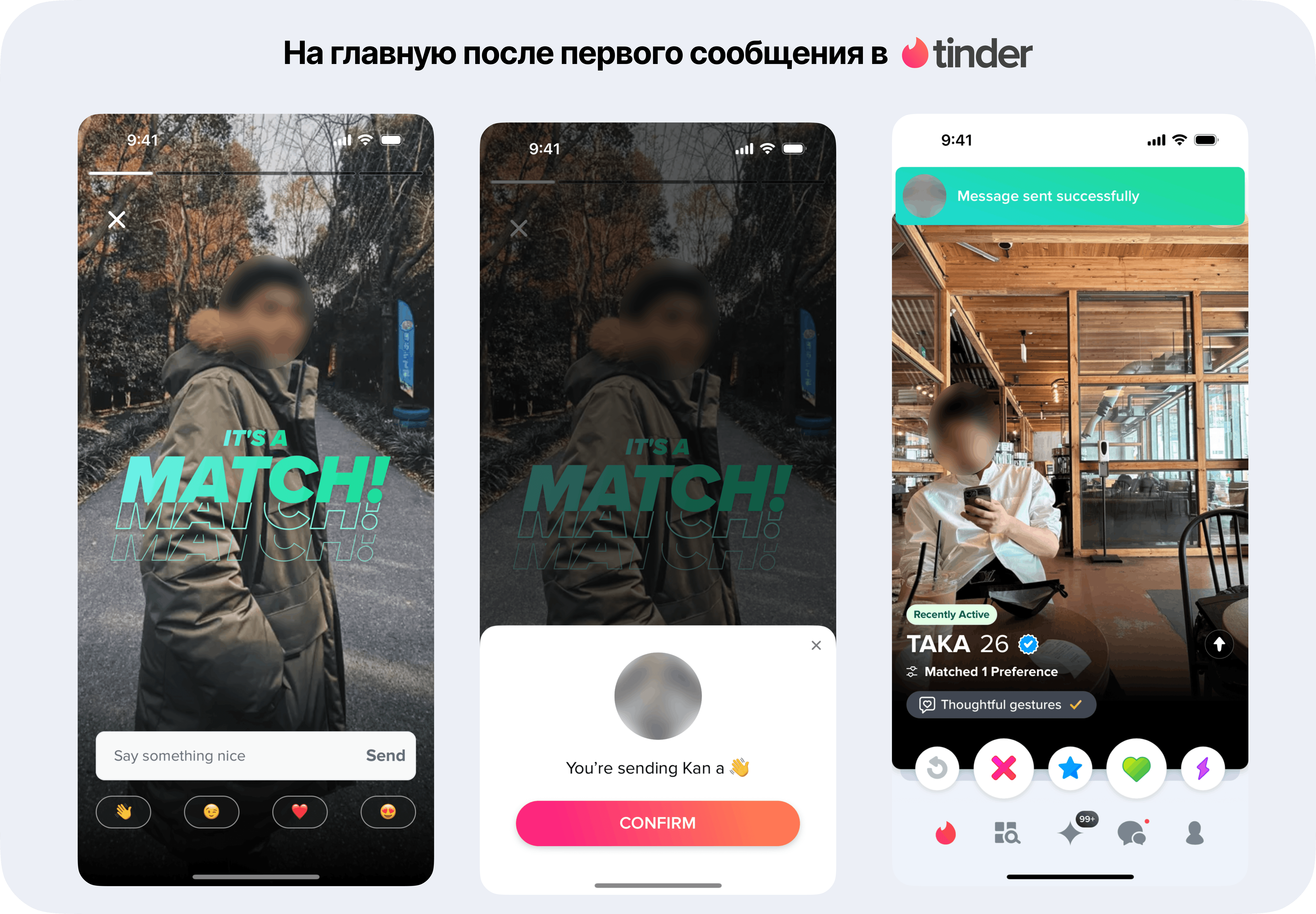 После мэтча приложения предлагают написать первое сообщение будущему партнёру. Однако сценарий, который происходит после отправки, не один. В одном случае сервис сразу после отправки сообщения возвращает пользователя на главный экран, в другом — переносит в диалог с собеседником, чтобы продолжить общение. Статистически оба варианта ± одинаково популярны у конкурентов.