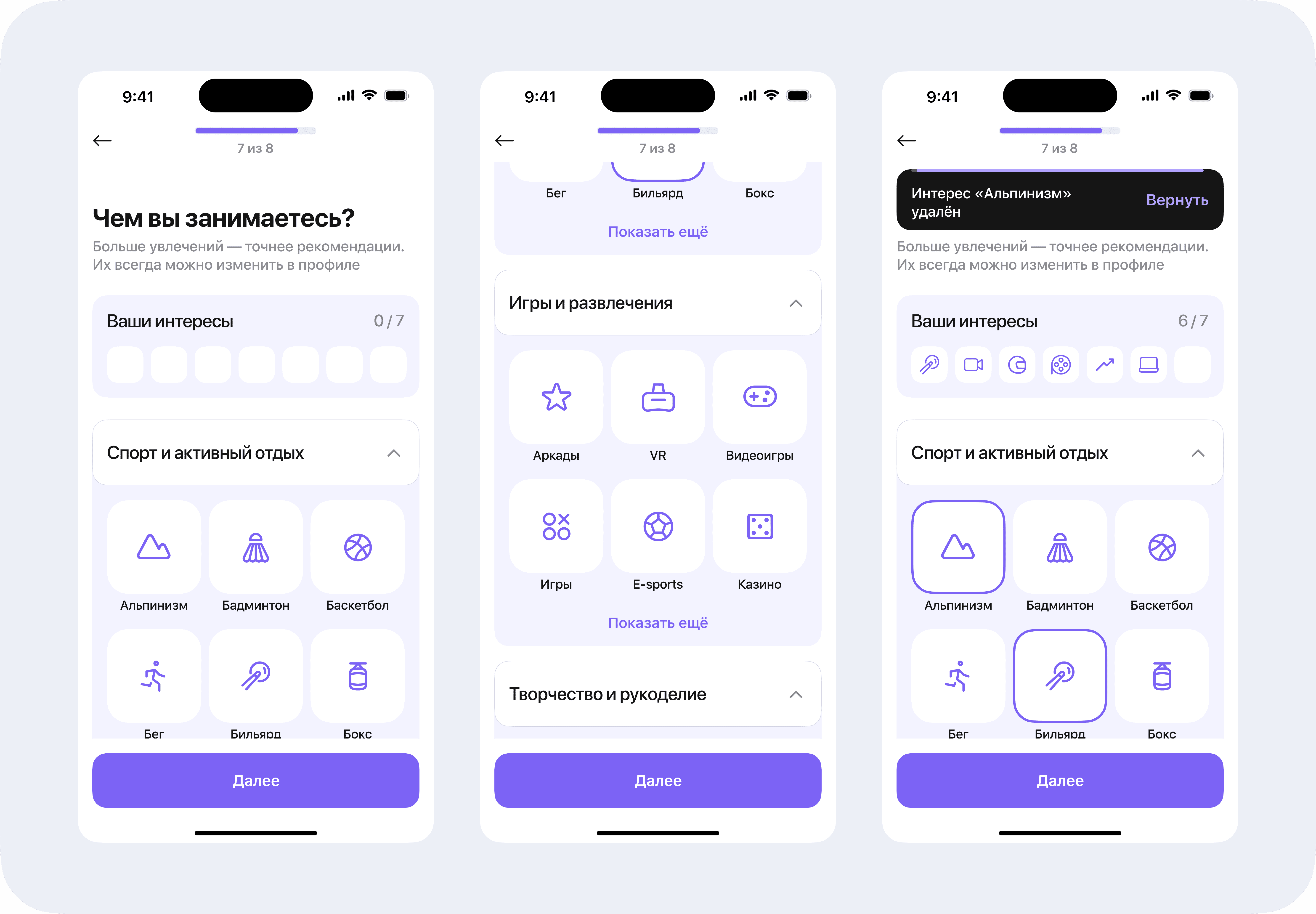 Мы продумали более лёгкую и лаконичную страницу выбора интересов. Все табы разбиты на категории в виде раскрывающихся списков. В каждой категории изначально отображается до шести самых популярных табов, а если пользователь не находит нужное — нажимает «Показать ещё». В верхней части страницы закреплён блок, дублирующий все уже выбранные интересы: так пользователь может отменить выбор максимально быстро, не тратя время на повторный поиск нужного таба.