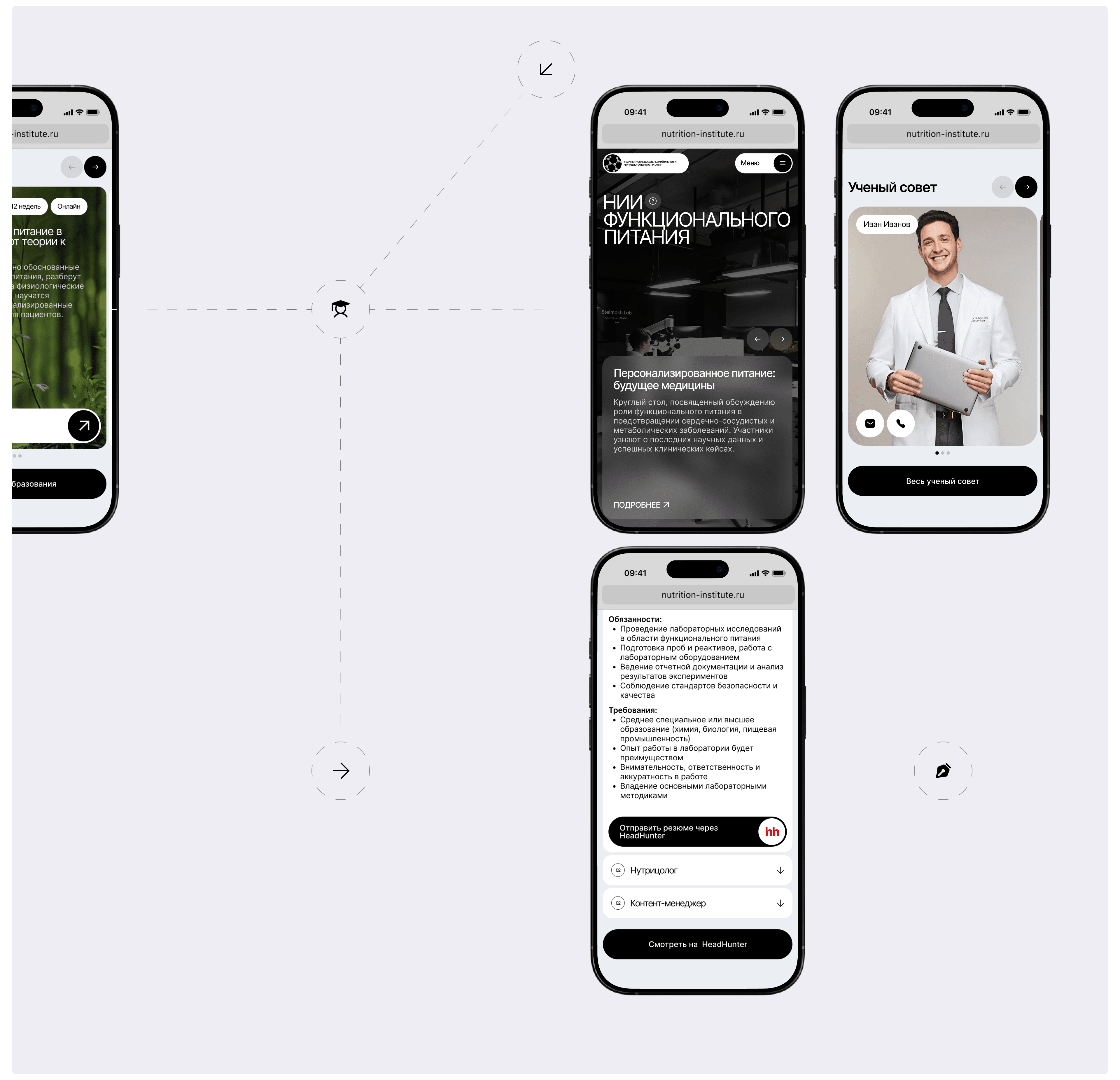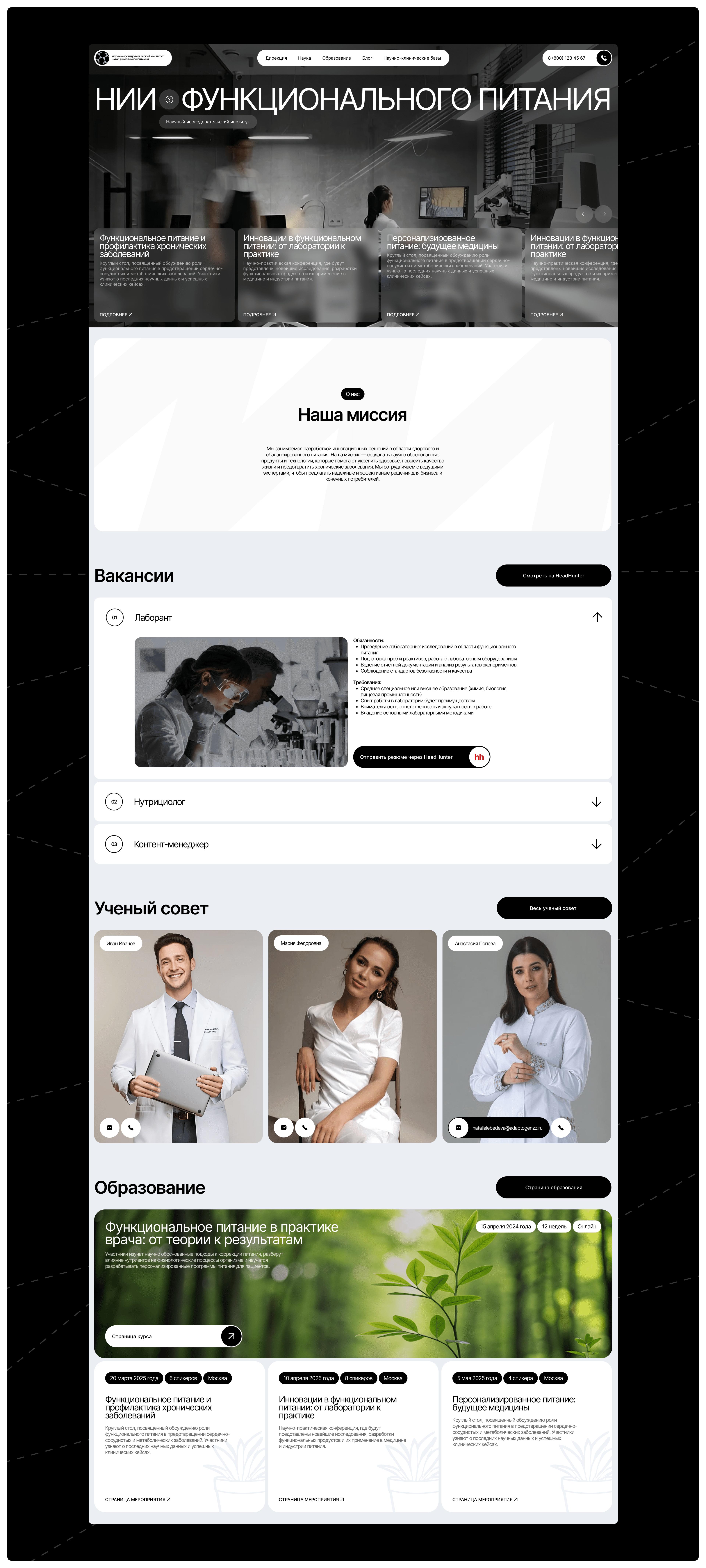 Научно-исследовательский институт функционального питания — образовательная организация в сфере здорового и медицинского питания. Данный коммерческий проект выполнялся пока я был в ExtentLab: я самостоятельно реализовал дизайн сайта с нуля.