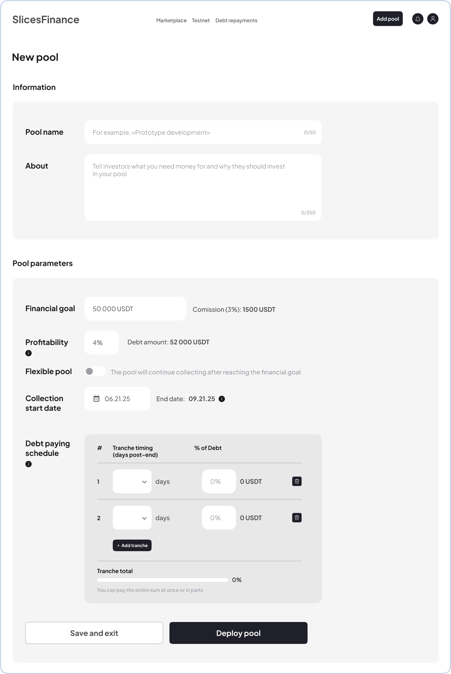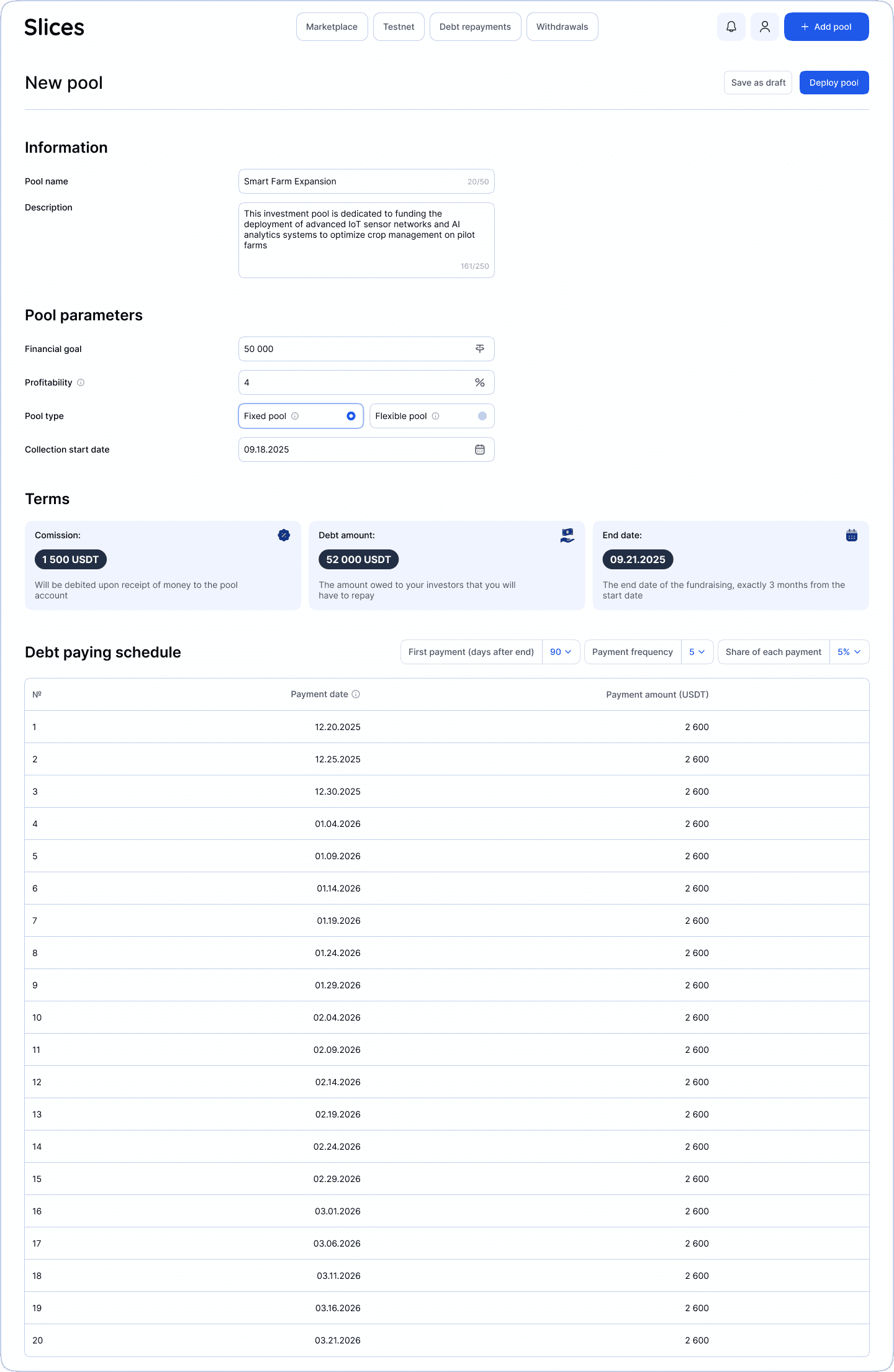 Переходя на страницу создания пула, человек должен указать все данные (название, описание сумма, процент окупаемости и тд). После, ему приходилось полностью вручную заполнять график платежей, по которому он будет выплачивать задолженность перед инвесторами. Так это выглядело в прототипе:
