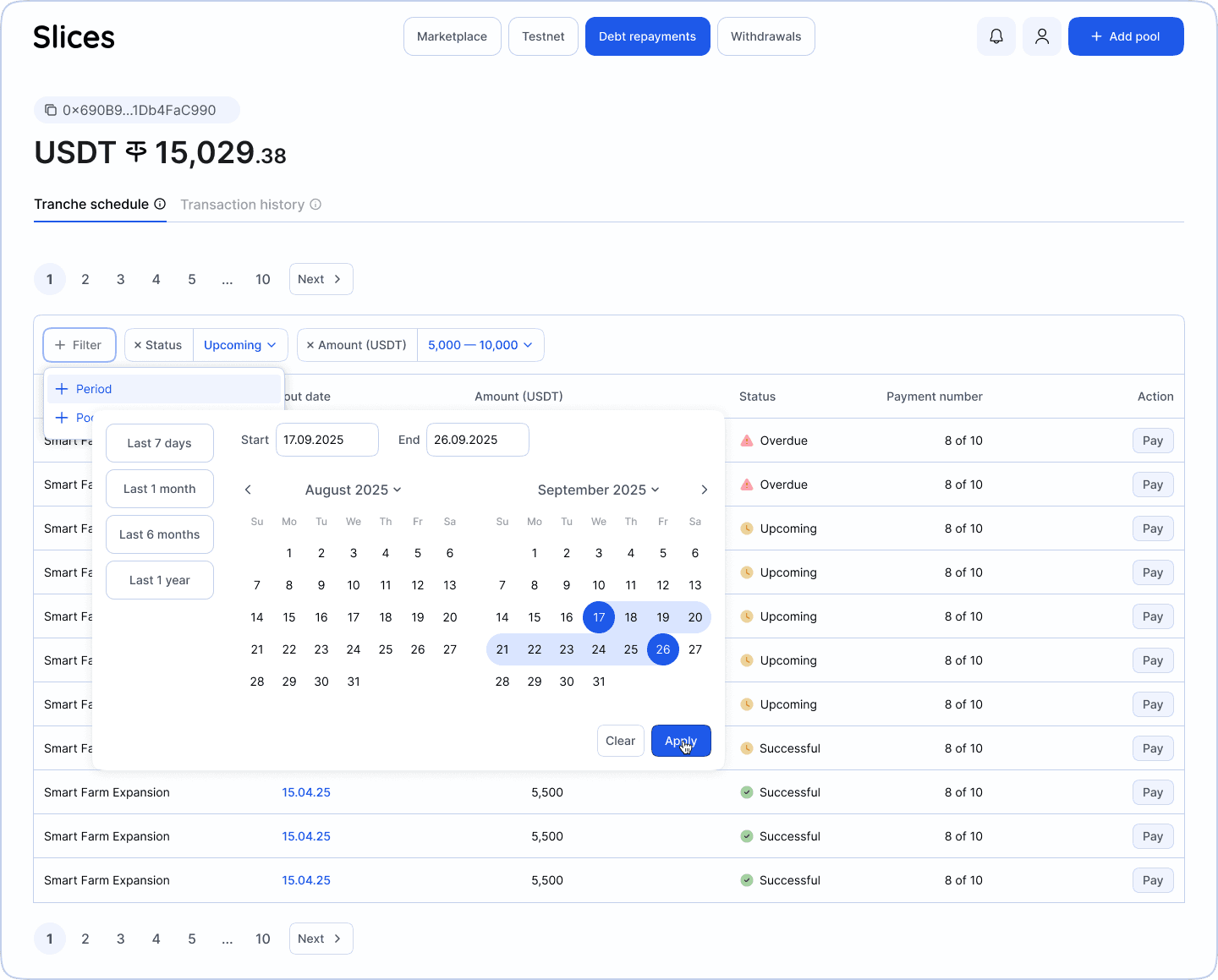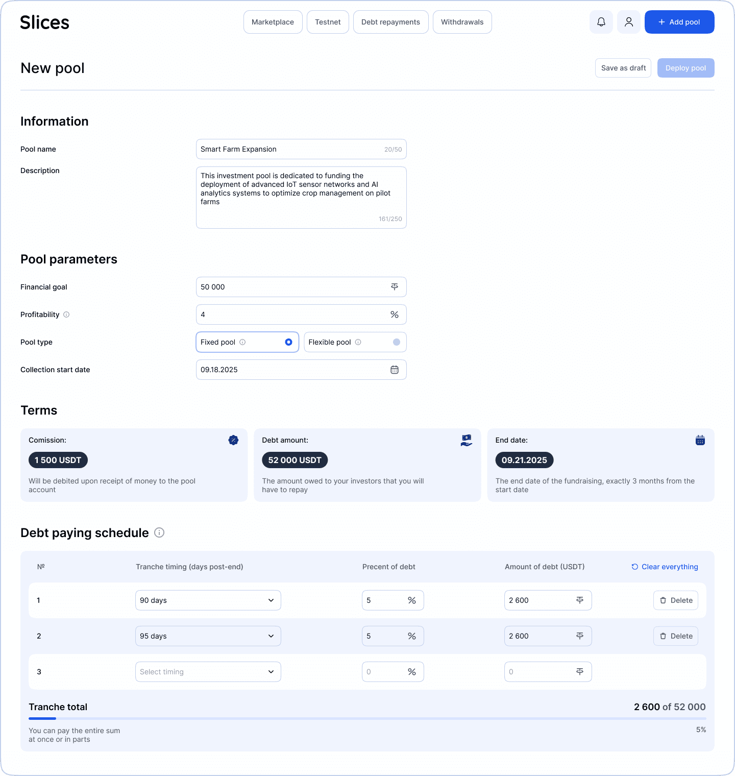 Дату платежа мы рассчитываем автоматически, так как вообще-то у системы уже есть все вводные для этого. Но, бережно напоминаем в тултипе, что в внеплановых ситуациях они могут двигаться (например, если пул имеет фиксированный тип и собрал инвестиции слишком быстро).