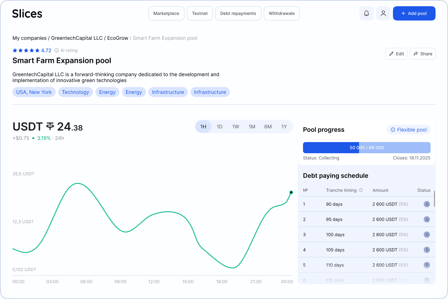 Slices — инвестиционная платформа для криптоинвесторов и овнеров физических бизнесов (кафе, сеть магазинов или строительная корпорация). Сервис позволяет эффективно собирать деньги на нужды бизнеса и делать ощутимо выгодные инвестиции на базе личного уникального блокчейна, с помощью криптовалюты. К проекту я присоединился в роли ключевого продуктового дизайнера под руководством арт-директора уже после итерации работ UX-редакторов и прототипировщиков.